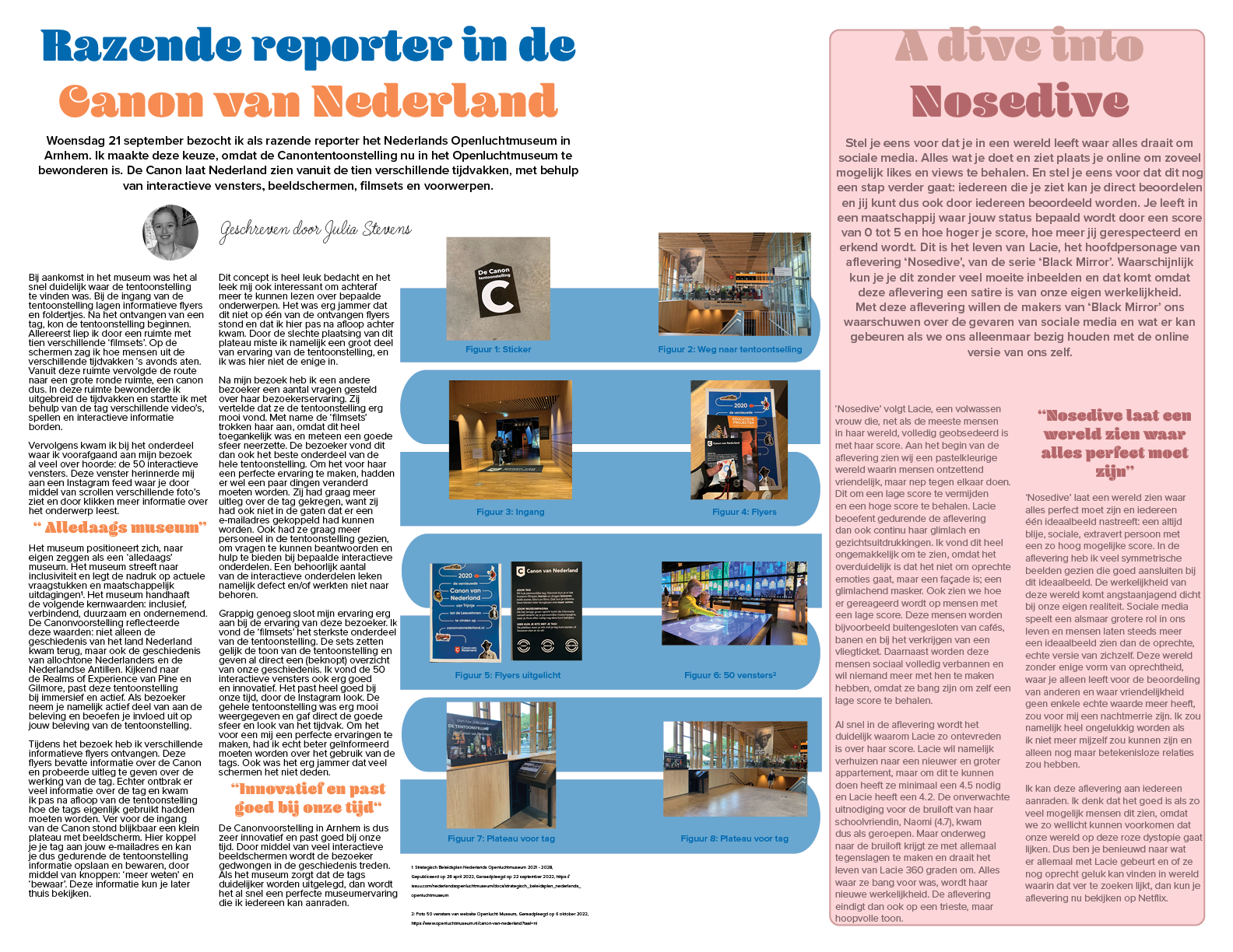 Voor deze opdracht was het de bedoeling om een museum te bezoeken en over deze ervaring te schrijven. Ook hebben we klassikaal 'Nosedive' gekeken. Mijn recensie van deze aflevering is ook in deze spread verwerkt.